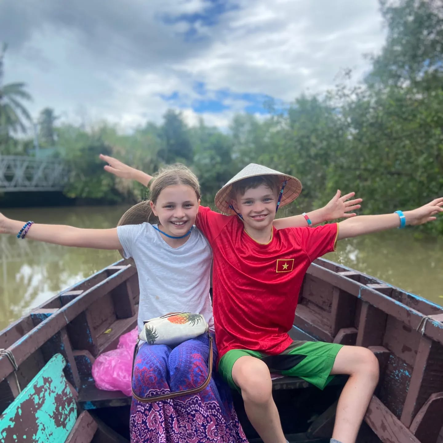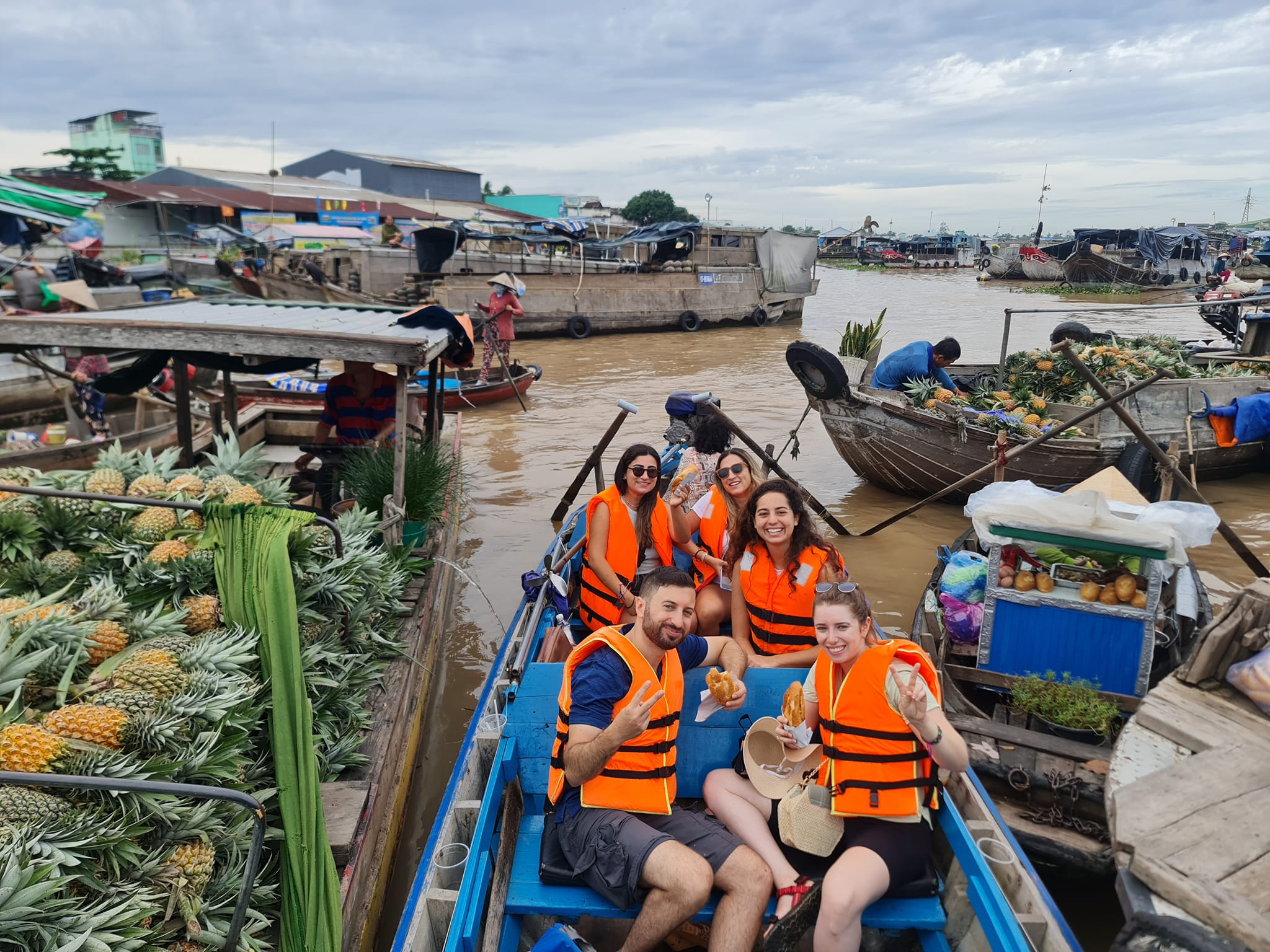 ● Taking a boat during Ben Tre's tour of the Ham Luong River.